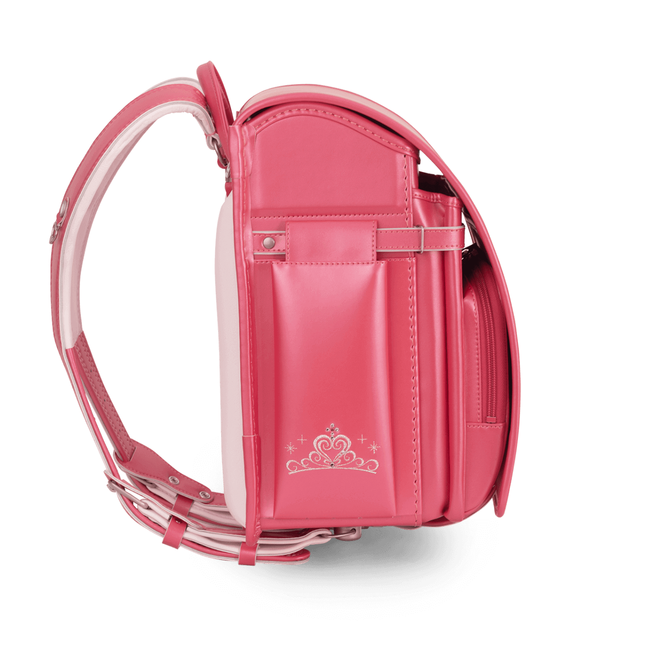 憧れをカタチにするため、お姫様の世界観と、カラーの組み合わせにこだわりました。特にテープ(フチ)のジュエルピーチとの組み合わせがポイントで、テープのカラーも変更を加えながら、今に至っています。かわいいドレスやティアラを毎日身につけるような気分で、笑顔で通学できるように思いを込めて作った、女の子に不動の人気No.1のシリーズです。